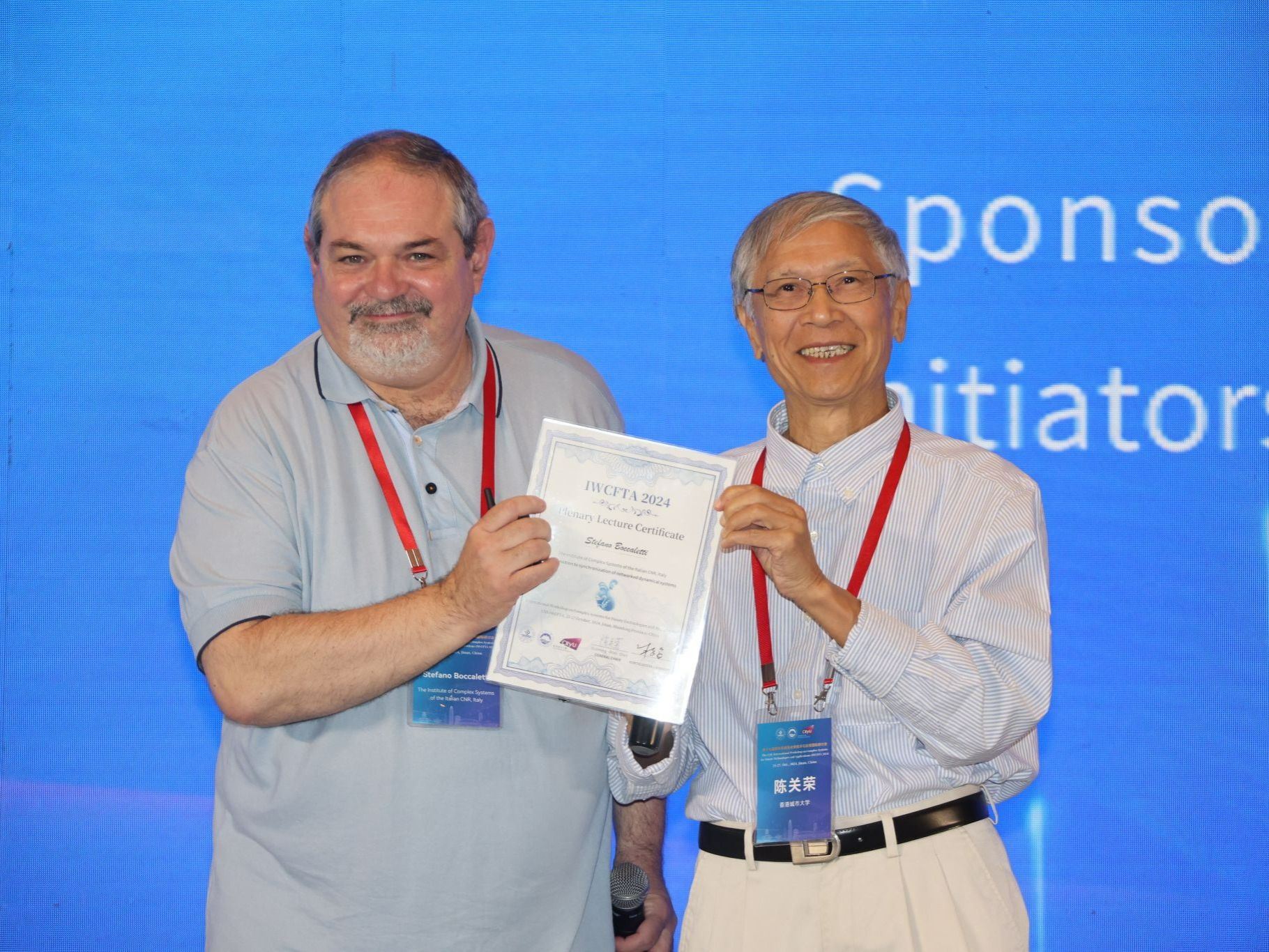 本次会议分为8个大会主旨报告和10个分会场报告两部分。共收到论文总数 130余篇,到会报告交流论文115篇。主旨报告中,意大利国家科学院复杂系统研究所、欧洲科学院院士斯特凡诺·博卡莱蒂(Stefano Boccaletti)教授作题为“网络化动力系统向同步化的转换(The transition to synchronization of networked dynamical systems)”的报告;印度坎普尔理工学院马来•班纳吉(Malay Banerjee)教授作题为“图灵域外检测图灵模式的数值延拓(Numerical continuation to detect Turing pattern outside the Turing domain)”的报告;中国香港城市大学协理副校长谢智刚教授以“面向更绿色未来的演变电网(The evolving power grid towards a greener future)”为题讨论了电力电子系统渗透到电网中的各种电路和系统问题及对电网持续演变的影响;加拿大滑铁卢大学刘新芝教授分享了在领导者—跟随者时滞多智能体系统的共识混合协议时间延迟方面的观点;北京航空航天大学副校长吕金虎教授通过线上的形式与大家讨论群体智能感知和协同控制的新进展相关的问题;西南大学的王丽丹教授作题为“类脑计算与智能控制(In-memory computing memristor device and its AI accelerators)”的报告;电子科技大学卢多维科·米纳蒂(Ludovico Minati)教授作题为“跨越神经元与硅:关于异常电子电路与神经科学之间关系的一些思考(Across neurons and silicon: some ideas about the relationship between unusual electronic circuits and neuroscience)”的报告;广东工业大学的禹思敏教授与大家共同探讨了混沌密码的分析与设计问题。
