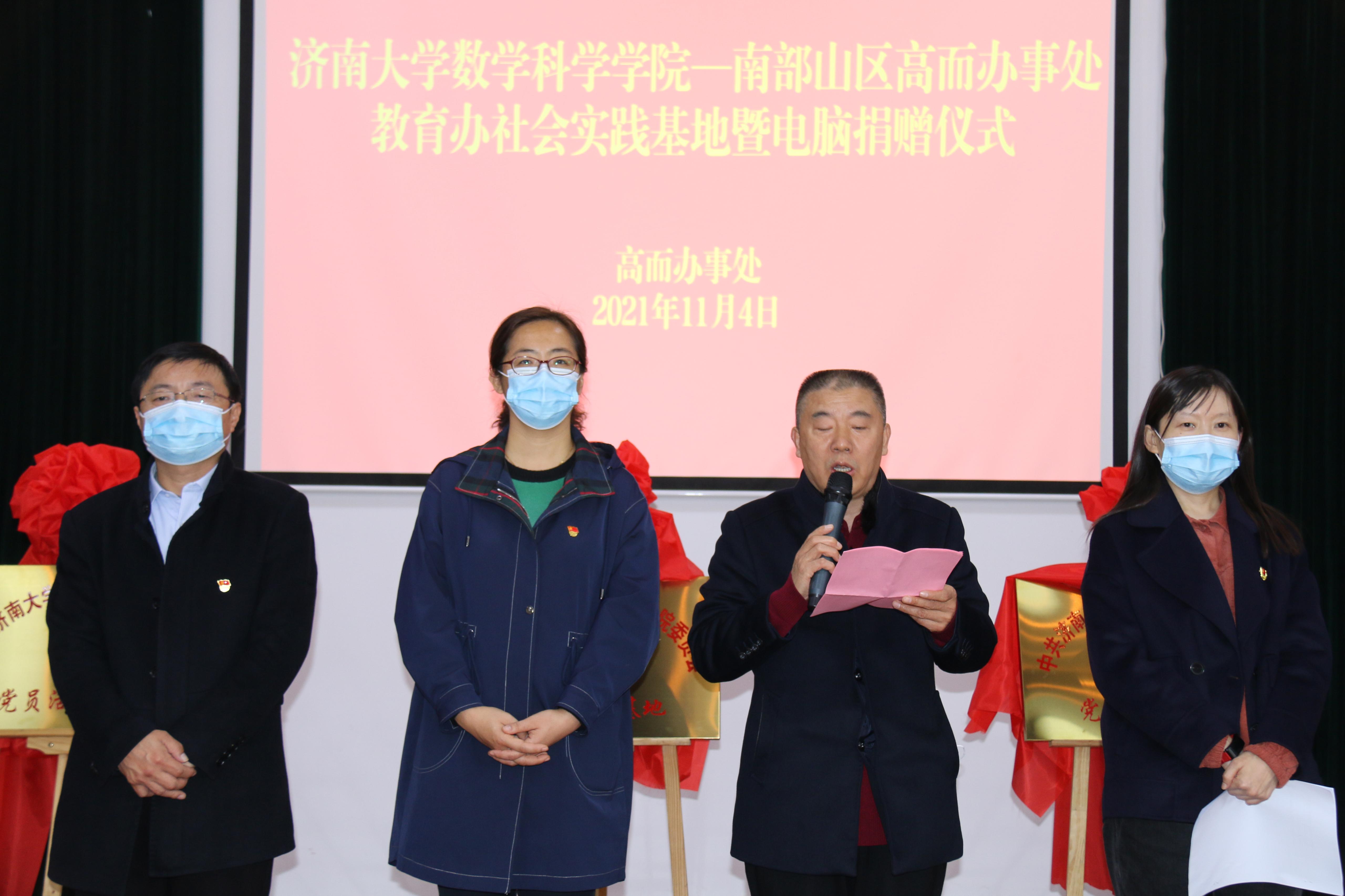签约现场,英国365集团官网党委书记侯启海代表济南大学向南山管委会高而办事处中小学捐赠了40台电脑。