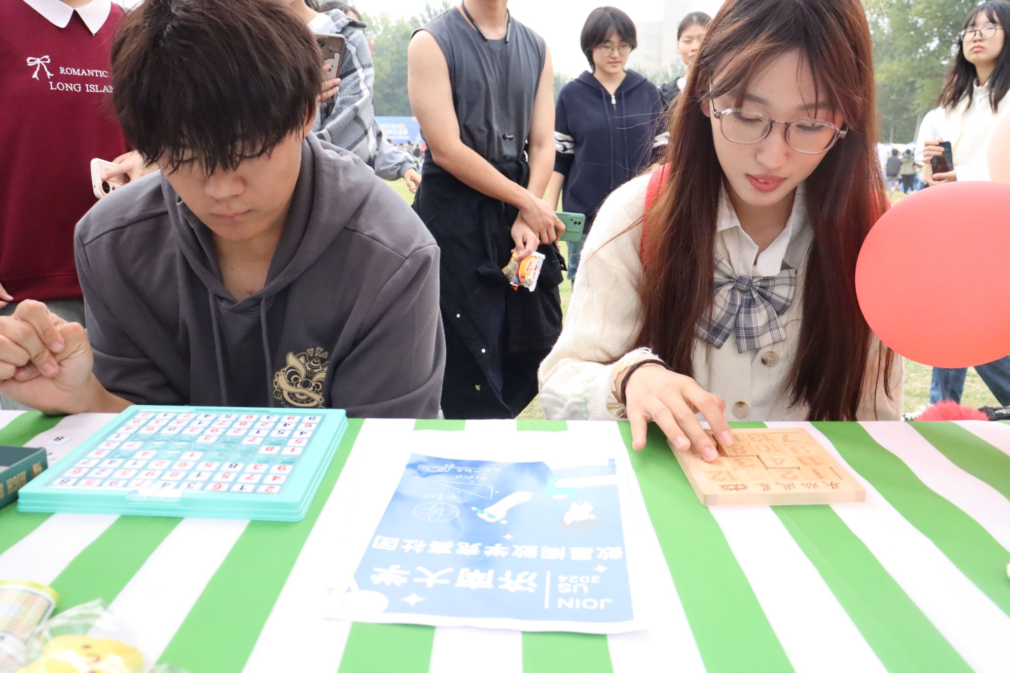 数学不只有枯燥的定理和公式,更有无限乐趣、无限可能。在活动现场,济南大学数星阁数学竞赛协会就以其别具一格的魅力吸引着众多观众欣然前往。数独、华容道等各类益智游戏,吸引了不同学院各个年级的同学们来此进行思维碰撞和脑力挑战。在游戏过程中,参与者沉着冷静,运筹帷幄,全神贯注于眼前的挑战,通过游戏体味数学知识,在探索中感受数学文化。此外,竞赛题目令人眼前一亮,以其多样的风格吸引着参与者积极投身其中。同时,数学建模也凭借其蕴含的团结精神与数学应用魅力,吸引了众多学生的关注。济南大学智慧树数学建模协会通过四面翻盘、俄罗斯方块拼图等游戏,让参与者在实践中体悟数学的迷人魅力,在竞争中磨砺自身思维能力,尽享数学之趣。