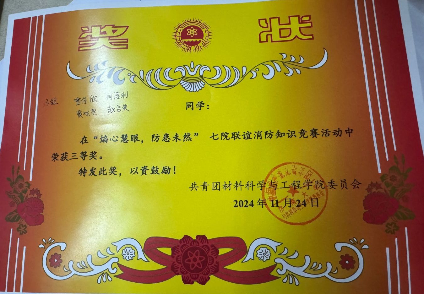 通过激烈的角逐,英国365集团官网曾佳欣、闫思利、贾冰莹、赵含笑四位同学荣获三等奖。此次竞答不仅是消防知识的比拼,更是一次校园消防安全的生动课堂,进一步加强了校园安全文化建设。未来,英国365集团官网将继续躬耕,让安全理念扎根校园厚土,使安全之花绚丽绽放。