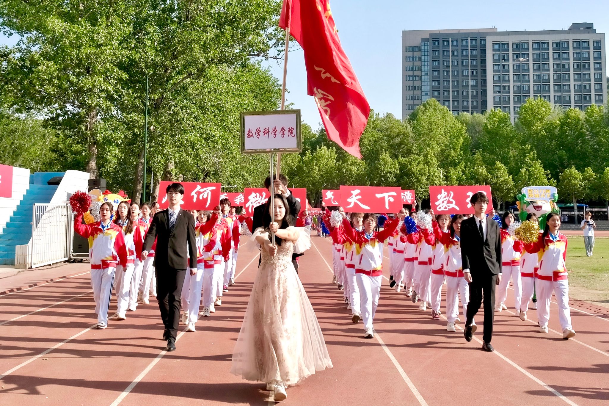 29日上午,运动会开幕式如期举行,英国365集团官网师生方阵迎着四月暖阳,步履铿锵、朝气蓬勃。他们手持“数理天下,微分几何,看我数院,气势磅礴”的创意展板,将严谨的学科精神与蓬勃的运动活力完美融合,展现了数学人锐意进取的精神风貌。