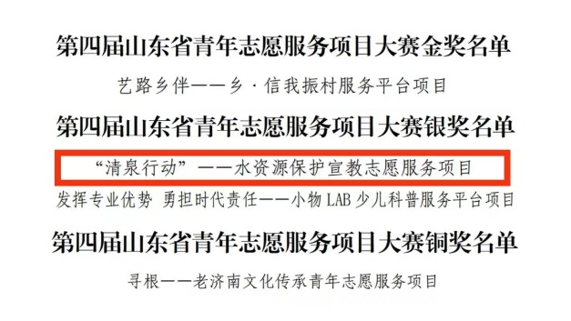 7月27日至28日,由团省委牵头主办的第四届山东省青年志愿服务项目大赛决赛在日照成功举办。经过激烈角逐,我校四个项目分获金银铜奖,其中由我院于洋老师指导的“‘清泉行动’——水资源保护宣教志愿服务项目”在第四届山东省青年志愿服务项目大赛获得银奖,并于近日接到通知,该项目被山东省青年志愿者协会推荐参加第六届中国青年志愿服务项目大赛。