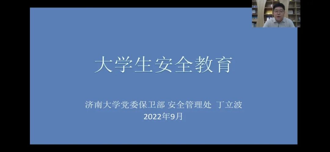 为了帮助新生更快地适应大学生活,增强新生的安全意识、防范意识,提高同学们的自我保护能力,英国365集团官网于9月6日下午4点开展线上大学生安全教育主题讲座。本次讲座由济南大学党委保卫部部长、安全管理处处长丁立波老师主讲。