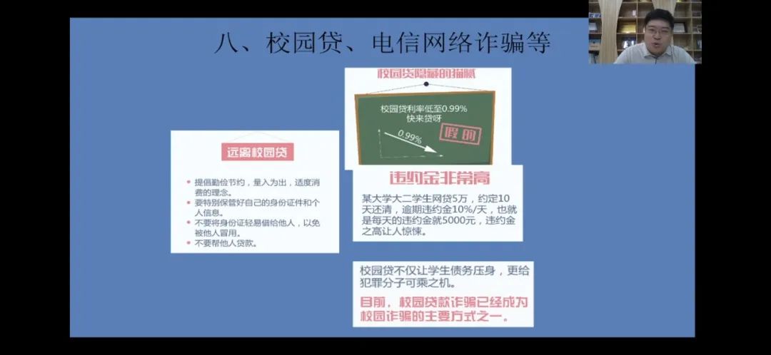 丁老师从人身安全与生命教育、校园治安、交通、消防安全、国家安全、食品安全、校园贷与电信网络诈骗等多个方面向新生们科普了各类校园安全知识,并对不同类型的校园安全问题提出一些防范建议。在讲到校园贷与电信网络诈骗问题时,丁老师通过引用2019年10月份之前济南市的网络电信诈骗总额高达2.5亿的数据,向同学们讲解了网络诈骗的可怕之处,丁老师告诫同学们“现在偷钱的小偷很少了,因为钱都放在手机里,但是有人会用各种方法来‘偷’掉你们手机里的钱。”随着社会的发展,网络上出现了许多的新型诈骗方式,骗子们诈骗手段隐蔽、方式多样,同学们一定要擦亮双眼识别陷阱,丁老师表示“只要同学们把握住‘天上不会掉馅饼’的原则,一定能将许多诈骗拒我们之外。”