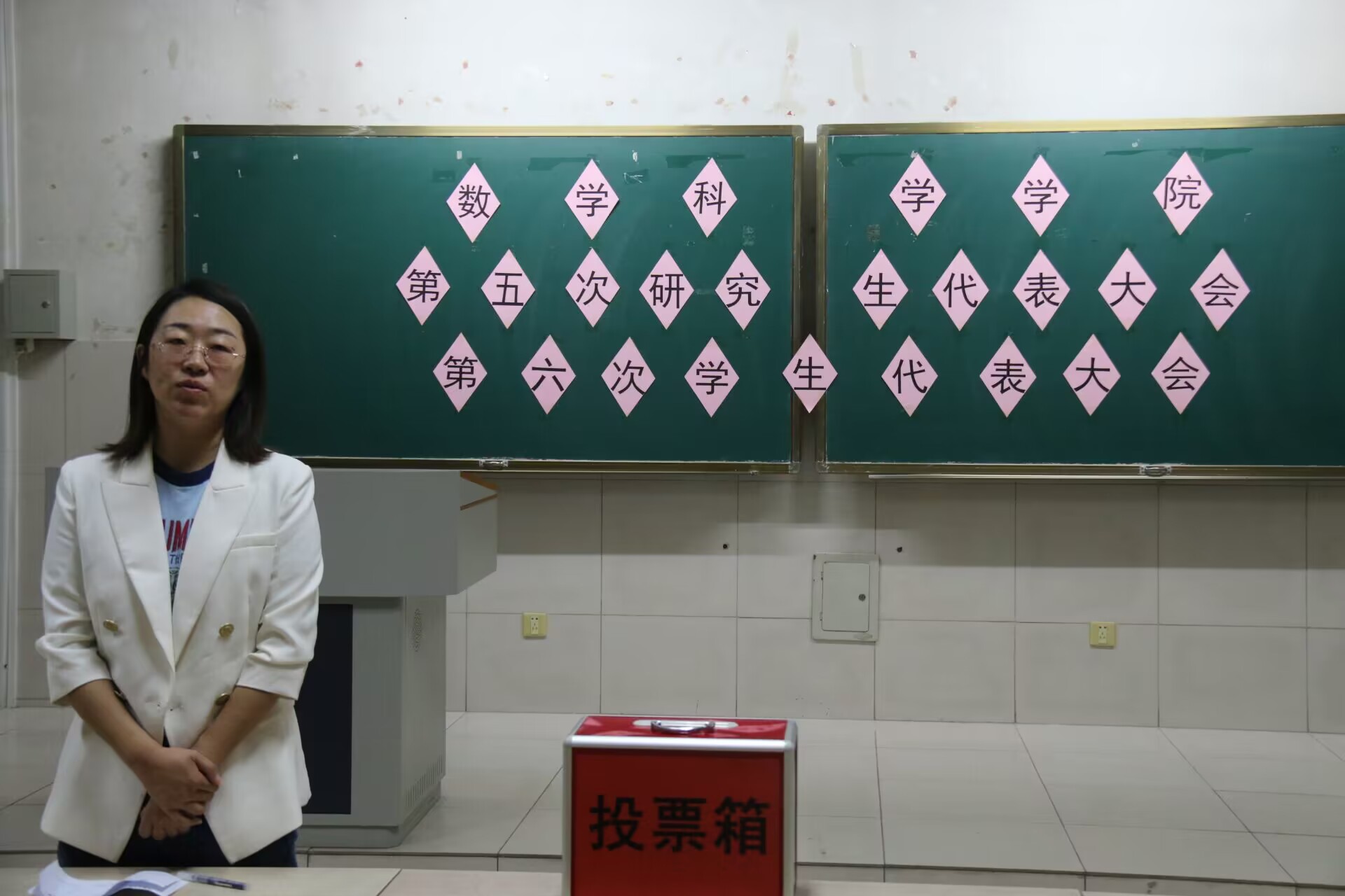 大会伊始,主持人介绍本次大会的主要议程并说明选举要求,接着依次向参会人员介绍候选人的基本情况。大会严格根据《英国365集团官网学、研代会选举办法》设置监票人、计票人,并依据规定采用无记名投票方式进行差额选举。在于洋老师的监督指导之下,学生们依次有序将选票投入红色的投票箱。本次投票工作以民主选举的方式顺利有序进行,是一次公开、公平、公正的选举。各位参会人员珍视参与学生代表大会的权利,认真履行职责,积极参与选举工作。最终由于洋老师公布会议选举产生的学生代表,全场响起热烈的掌声。会议的最后,于洋老师总结了过去一年学生的建设性意见对学院的正向推动,并在黑板书写了接收学生建议的具体邮箱及办公室地址,鼓励大家积极建言献策参加学校的改革建设,为提升和完善各方面的工作贡献学生力量。